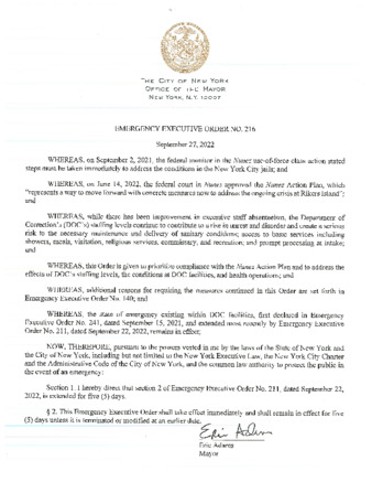 Emergency Executive Order No. 216, extends Emergency Executive Order No. 211, dated September 22, 2022, for five (5) days if this relates to Rikers.