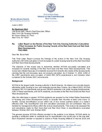 Letter Report on the Review of the New York City Housing Authority’s Calculation of Rent Increases for Public Housing Tenants at the Red Hook East and