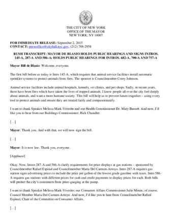 Mayor's Press Release: MAYOR DE BLASIO HOLDS PUBLIC HEARINGS AND SIGNS INTROS. 145-A, 287-A AND 586-A; HOLDS PUBLIC HEARINGS FOR INTROS. 682-A, 700-A