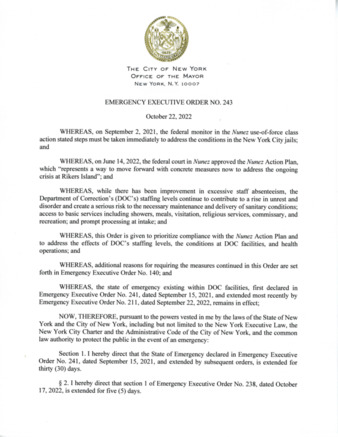 Emergency Executive Order No. 243, is being submitted to extend Emergency Executive Order No. 238, dated October 17, 2022, for five (5) days, if this relates to Rikers.