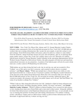MAYOR ADAMS, MAJORITY LEADER SCHUMER ANNOUNCE FIRST-IN-NATION STREET DELIVERISTAS HUBS TO SERVE NYC’S FOOD DELIVERY WORKERS