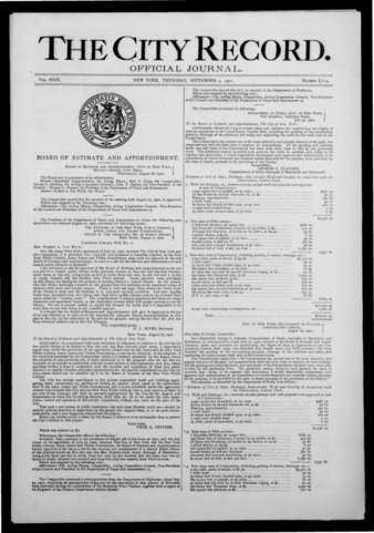 The City Record newspaper publishes notices which includes but is not limited to: public hearings and meetings, public auctions and sales, solicitations and awards and official rules proposed and adopted by city agencies. This is the City Record Newspaper for September 05, 1901.