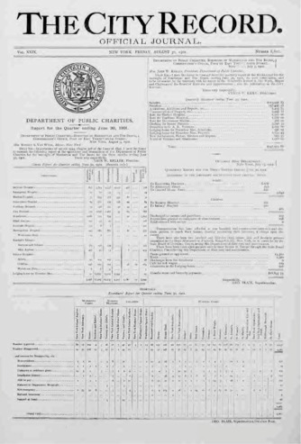 The City Record newspaper publishes notices which includes but is not limited to: public hearings and meetings, public auctions and sales, solicitations and awards and official rules proposed and adopted by city agencies. This is the City Record Newspaper for August 30, 1901.