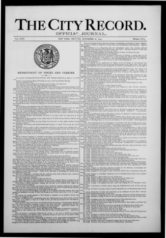 The City Record newspaper publishes notices which includes but is not limited to: public hearings and meetings, public auctions and sales, solicitations and awards and official rules proposed and adopted by city agencies. This is the City Record Newspaper for November 27, 1901.