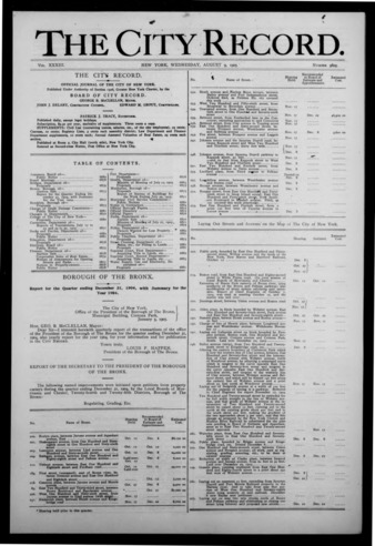 The City Record newspaper publishes notices which includes but is not limited to: public hearings and meetings, public auctions and sales, solicitations and awards and official rules proposed and adopted by city agencies. This is the City Record Newspaper for August 09, 1905.