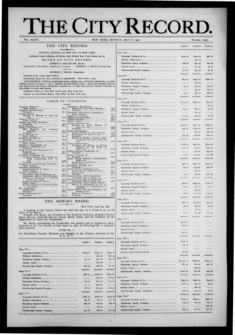 The City Record newspaper publishes notices which includes but is not limited to: public hearings and meetings, public auctions and sales, solicitations and awards and official rules proposed and adopted by city agencies. This is the City Record Newspaper for May 05, 1907.