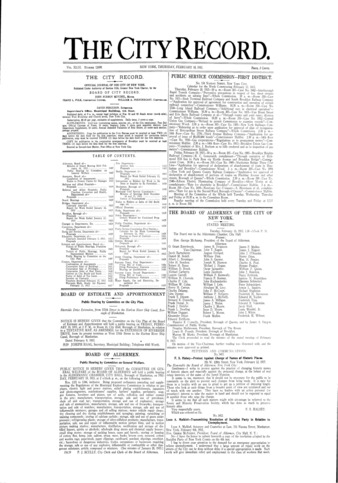The City Record newspaper publishes notices which includes but is not limited to: public hearings and meetings, public auctions and sales, solicitations and awards and official rules proposed and adopted by city agencies. This is the City Record Newspaper for February 18, 1915.
