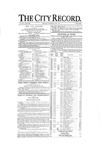 The City Record newspaper publishes notices which includes but is not limited to: public hearings and meetings, public auctions and sales, solicitations and awards and official rules proposed and adopted by city agencies. This is the City Record Newspaper for June 07, 1916 with supplement.