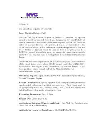 Citywide report on EMS transports during the twelve-month period ending on June 30 of the same year. Each report shall be disaggregated by school and by race/ethnicity, year of birth and whether the individual is receiving special education services.