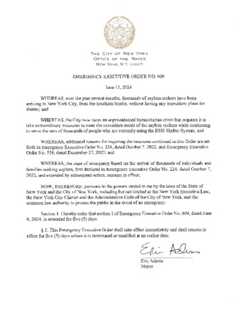 Emergency Executive Order No. 606, is being submitted to extend Emergency Executive Order No. 604, dated June 8, 2024, for five (5) days, if this relates to the state of emergency based on the arrival of thousands of individuals and families seeking asylum.