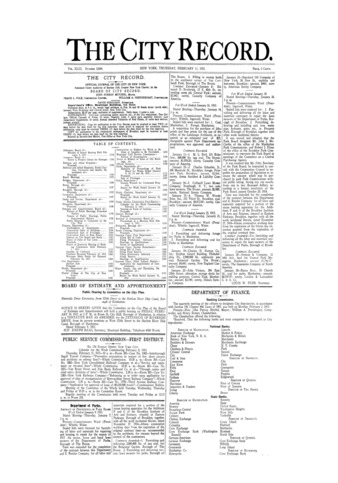 The City Record newspaper publishes notices which includes but is not limited to: public hearings and meetings, public auctions and sales, solicitations and awards and official rules proposed and adopted by city agencies. This is the City Record Newspaper for February 11, 1915.