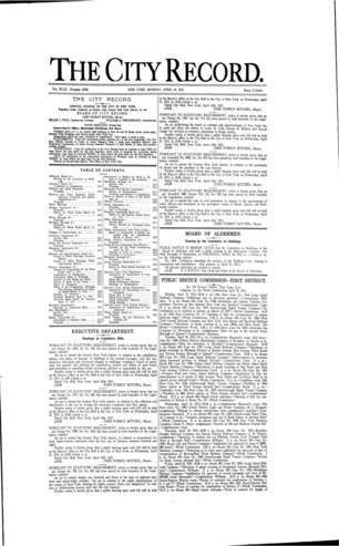 The City Record newspaper publishes notices which includes but is not limited to: public hearings and meetings, public auctions and sales, solicitations and awards and official rules proposed and adopted by city agencies. This is the City Record Newspaper for April 19, 1915.