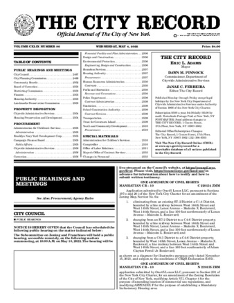 The City Record newspaper publishes notices which includes but is not limited to public hearings and meetings, public auctions and sales, solicitations and awards and official rules proposed and adopted by city agencies.