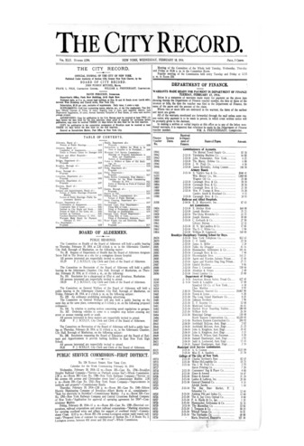 The City Record newspaper publishes notices which includes but is not limited to: public hearings and meetings, public auctions and sales, solicitations and awards and official rules proposed and adopted by city agencies. This is the City Record Newspaper for February 18, 1914 with supplement.