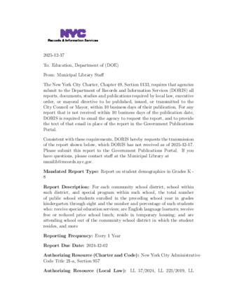 For each community school district, school within such district, and special program within such school, the total number of public school students enrolled in the preceding school year in grades kindergarten through eight and the number and percentage of such students who: receive special education services; are English language learners; receive free or reduced price school lunch; reside in temporary housing; and are attending school out of the community school district in which the student resides, and more