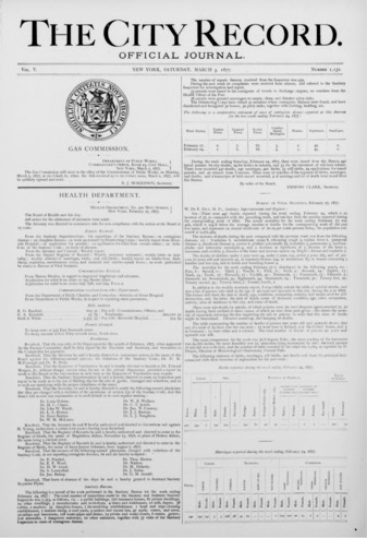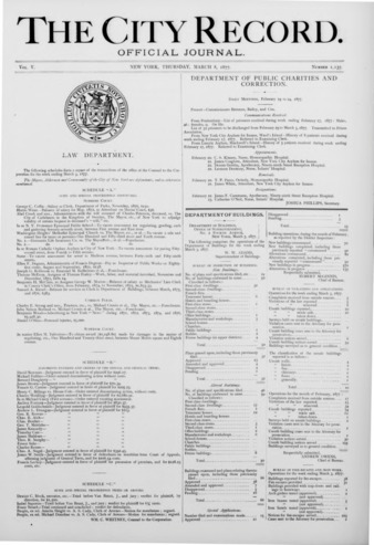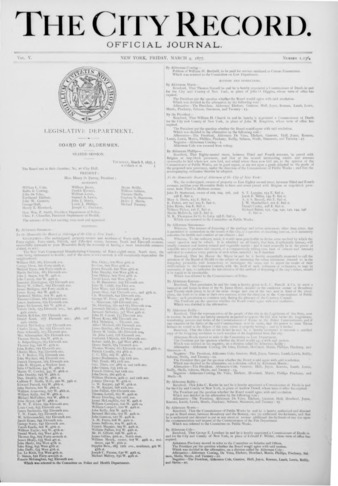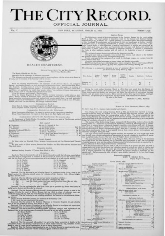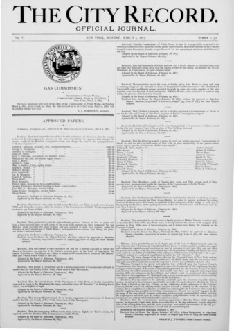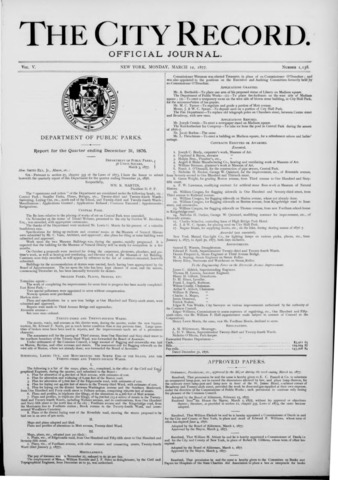 The City Record newspaper publishes notices which includes but is not limited to: public hearings and meetings, public auctions and sales, solicitations and awards and official rules proposed and adopted by city agencies. This is the City Record Newspapers for March 1877.