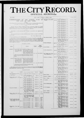 The City Record newspaper publishes notices which includes but is not limited to: public hearings and meetings, public auctions and sales, solicitations and awards and official rules proposed and adopted by city agencies. This is the City Record Newspaper for April 08, 1902.