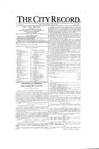 The City Record newspaper publishes notices which includes but is not limited to: public hearings and meetings, public auctions and sales, solicitations and awards and official rules proposed and adopted by city agencies. This is the City Record Newspaper for April 30, 1910.