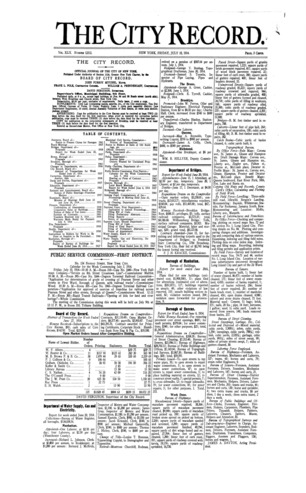 The City Record newspaper publishes notices which includes but is not limited to: public hearings and meetings, public auctions and sales, solicitations and awards and official rules proposed and adopted by city agencies. This is the City Record Newspaper for July 10, 1914 with supplement.