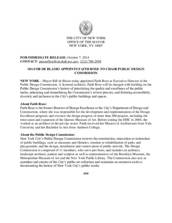Mayor's Press Release: MAYOR DE BLASIO APPOINTS FAITH ROSE TO CHAIR PUBLIC DESIGN COMMISSION