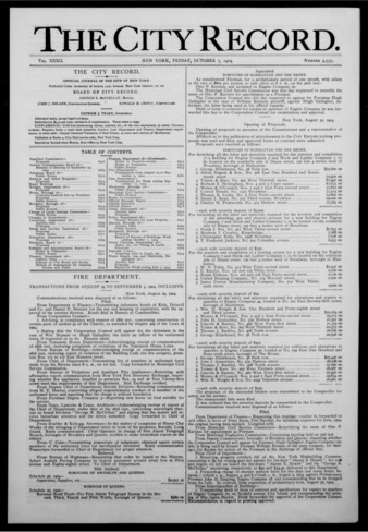 The City Record newspaper publishes notices which includes but is not limited to: public hearings and meetings, public auctions and sales, solicitations and awards and official rules proposed and adopted by city agencies. This is the City Record Newspaper for October 07, 1904.