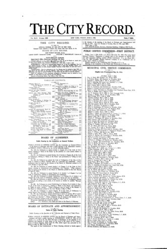 The City Record newspaper publishes notices which includes but is not limited to: public hearings and meetings, public auctions and sales, solicitations and awards and official rules proposed and adopted by city agencies. This is the City Record Newspaper for June 02, 1916.