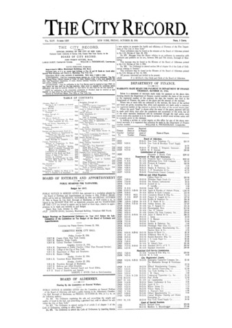The City Record newspaper publishes notices which includes but is not limited to: public hearings and meetings, public auctions and sales, solicitations and awards and official rules proposed and adopted by city agencies. This is the City Record Newspaper for October 20, 1916.
