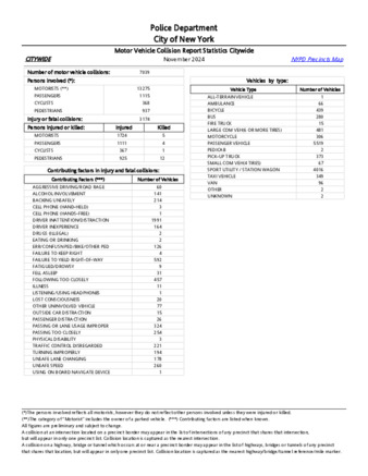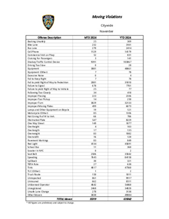 Pursuant to Admin Code Sect. 14-153(a), this monthly report contains 1) the number of moving violation summonses issued; 2) the number of traffic crashes; and 3) the number of traffic-related fatalities and injuries