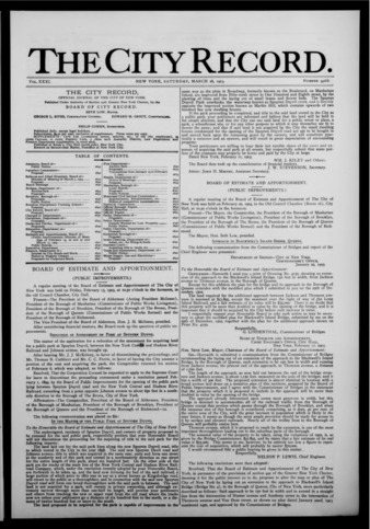The City Record newspaper publishes notices which includes but is not limited to: public hearings and meetings, public auctions and sales, solicitations and awards and official rules proposed and adopted by city agencies. This is the City Record Newspaper for March 28, 1903.
