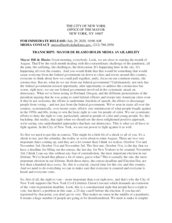 Mayor's Press Release: MAYOR DE BLASIO HOLDS MEDIA AVAILABILITY