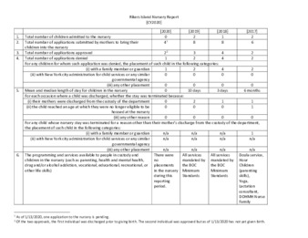 Pursuant to local law 120, this report provides information on the nursery program located on Rikers Island, including the total number of applications submitted, total number of applications that were approved and denied, the total number of children admitted to the nursery.