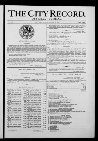 The City Record newspaper publishes notices which includes but is not limited to: public hearings and meetings, public auctions and sales, solicitations and awards and official rules proposed and adopted by city agencies. This is the City Record Newspaper for October 20, 1879.