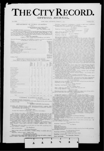 The City Record newspaper publishes notices which includes but is not limited to: public hearings and meetings, public auctions and sales, solicitations and awards and official rules proposed and adopted by city agencies. This is the City Record Newspaper for January 01, 1902.