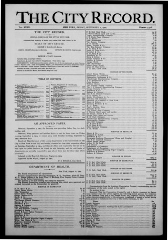 The City Record newspaper publishes notices which includes but is not limited to: public hearings and meetings, public auctions and sales, solicitations and awards and official rules proposed and adopted by city agencies. This is the City Record Newspaper for September 02, 1904.
