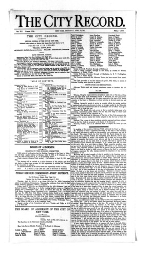The City Record newspaper publishes notices which includes but is not limited to: public hearings and meetings, public auctions and sales, solicitations and awards and official rules proposed and adopted by city agencies. This is the City Record Newspaper for April 10, 1913.