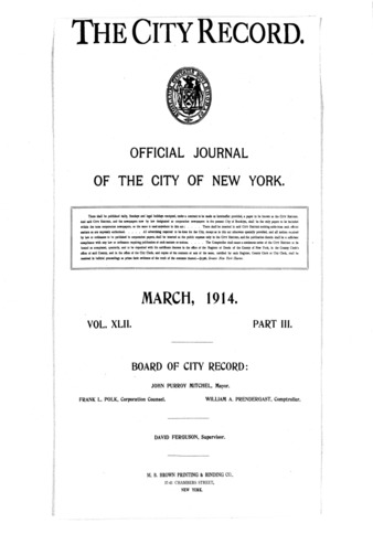 The City Record newspaper publishes notices which includes but is not limited to: public hearings and meetings, public auctions and sales, solicitations and awards and official rules proposed and adopted by city agencies. This is the City Record Newspaper for February 15, 1915.