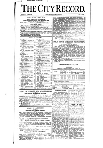 The City Record newspaper publishes notices which includes but is not limited to: public hearings and meetings, public auctions and sales, solicitations and awards and official rules proposed and adopted by city agencies. This is the City Record Newspaper for March 26, 1915.