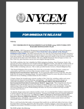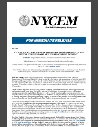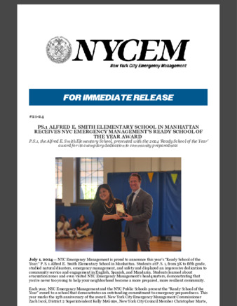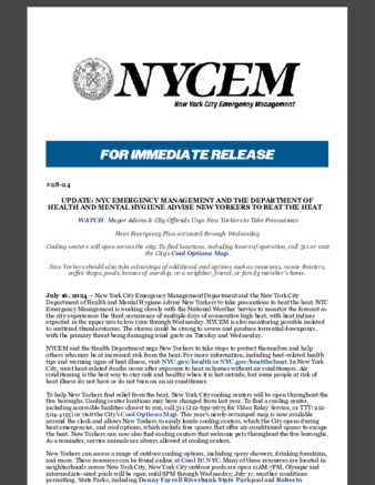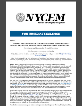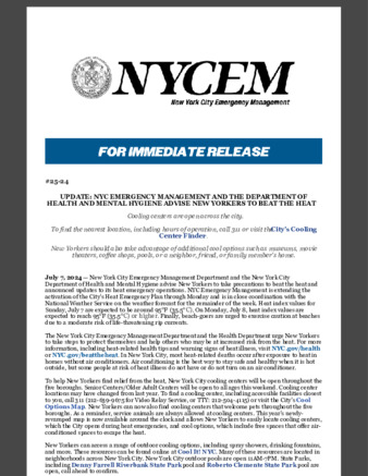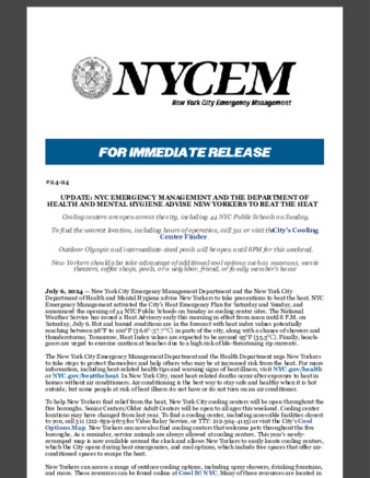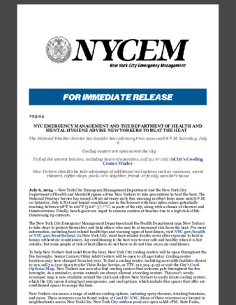 Press releases are designed to inform the public of an upcoming/ongoing emergency or special event. Some emergencies include coastal storms, winter weather and extreme heat. Releases also highlight special events including Ready New York presentations and other community preparedness initiatives.