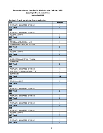 Pursuant to Admin Code Sect. 14-150(d), this monthly report contains information on complaints and arrests for violent felony offenses, assault, sex offenses, disorderly conduct, harassment, aggravated harassment, and offenses against public sensibilities that occurred in transit
