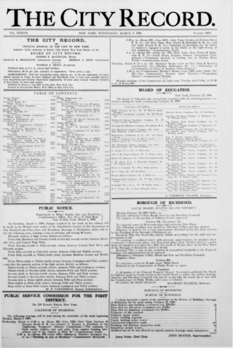 The City Record newspaper publishes notices which includes but is not limited to: public hearings and meetings, public auctions and sales, solicitations and awards and official rules proposed and adopted by city agencies. This is the City Record Newspaper for March 03, 1909.