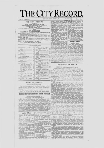 The City Record newspaper publishes notices which includes but is not limited to: public hearings and meetings, public auctions and sales, solicitations and awards and official rules proposed and adopted by city agencies. This is the City Record Newspaper for August 01, 1913.