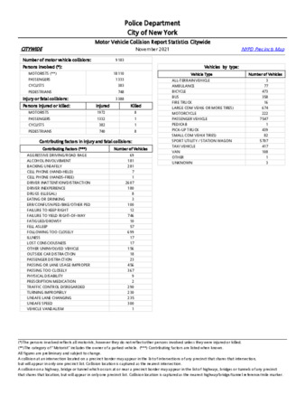 Pursuant to Admin Code Sect. 14-153(a), this monthly report contains 1) the number of moving violation summonses issued; 2) the number of traffic crashes; and 3) the number of traffic-related fatalities and injuries