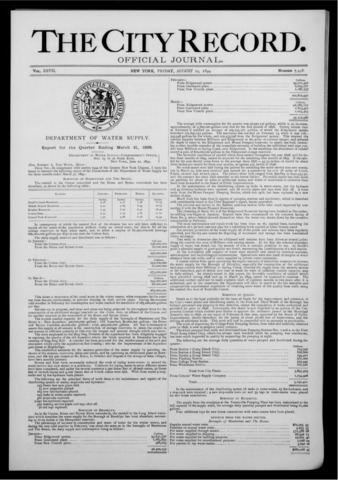 The City Record newspaper publishes notices which includes but is not limited to: public hearings and meetings, public auctions and sales, solicitations and awards and official rules proposed and adopted by city agencies. This is the City Record Newspaper for August 25, 1899.