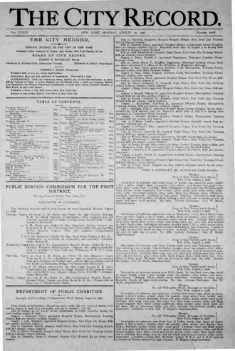The City Record newspaper publishes notices which includes but is not limited to: public hearings and meetings, public auctions and sales, solicitations and awards and official rules proposed and adopted by city agencies. This is the City Record Newspaper for August 17, 1908.