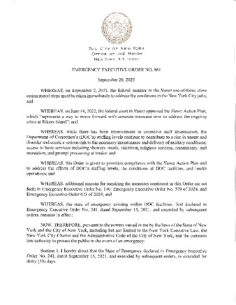 Emergency Executive Order No. 861 is being submitted to extend Emergency Executive Order No. 859, dated September 15, 2025; for five (5) days as it relates to Rikers.