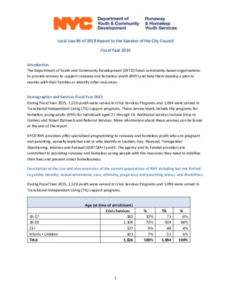 DYCD Local Law 86 Runaway and Homeless Youth Demographics Report FY25