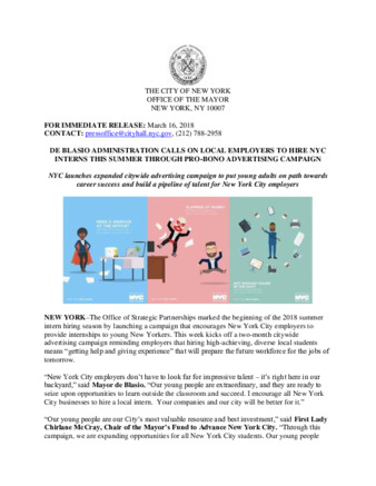 Press Release: DE BLASIO ADMINISTRATION CALLS ON LOCAL EMPLOYERS TO HIRE NYC INTERNS THIS SUMMER THROUGH PRO-BONO ADVERTISING CAMPAIGN