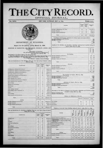 The City Record newspaper publishes notices which includes but is not limited to: public hearings and meetings, public auctions and sales, solicitations and awards and official rules proposed and adopted by city agencies. This is the City Record Newspaper for May 20, 1899.