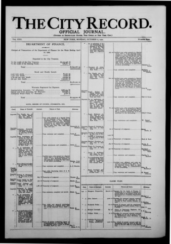 The City Record newspaper publishes notices which includes but is not limited to: public hearings and meetings, public auctions and sales, solicitations and awards and official rules proposed and adopted by city agencies. This is the City Record Newspaper for October 06, 1902.