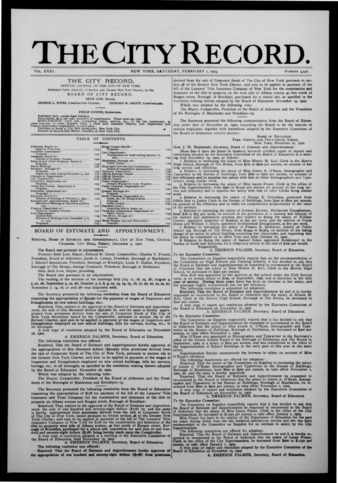 The City Record newspaper publishes notices which includes but is not limited to: public hearings and meetings, public auctions and sales, solicitations and awards and official rules proposed and adopted by city agencies. This is the City Record Newspaper for February 07, 1903.